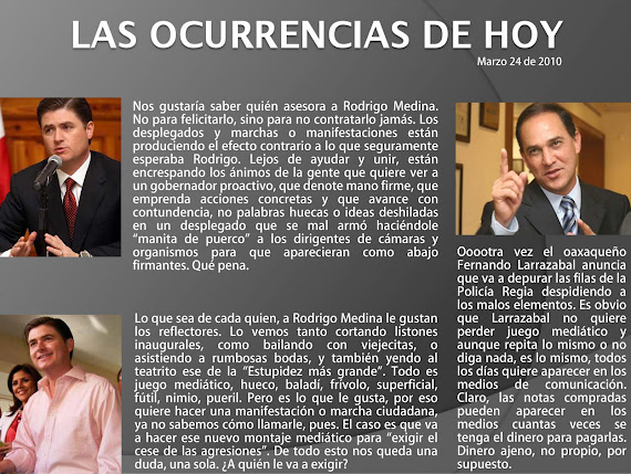 Rodrigo Medina lo único que ha demostrado durante los pocos meses que lleva de gobernador es la incapacidad para desempeñar el cargo que la población le otorgó gracias a la mercadotecnia política. Cuando aún falta un largo camino por recorrer de esta administración estatal, la ingobernabilidad ya esta manifiesta en las calles y en la incapacidad para establecer planes, programas y acciones directas que activen el desarrollo económico del estado y proporcionen la seguridad que como ciudadanos debemos tener a fin de salvaguardar a los nuevoleoneses. Lo que me queda claro es que Rodrigo Medina, no daría su vida por Nuevo León.