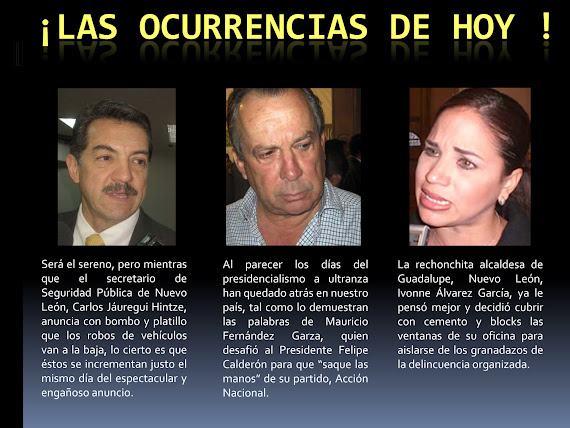 Aunque los políticos digan lo contrario, y más los priistas, el narco ha tomado el estado de nuevo leon en sus manos, nos tienen controlados y al menor ruido todos nos asustamos, no nos hagamos.